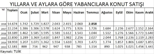bin 858 oldu. Yabancılara yapılan konut satışlarında, Temmuz 2018’de ilk sırayı